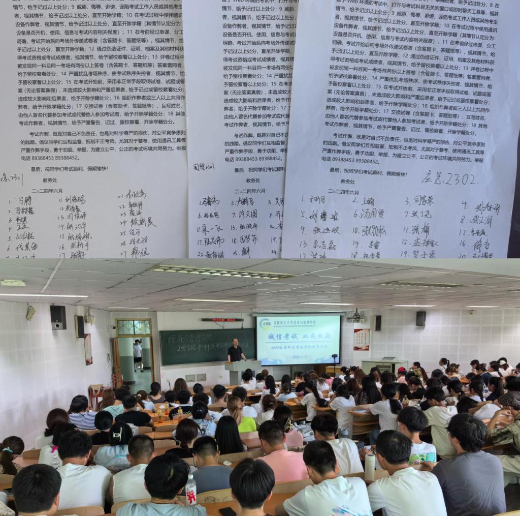 为进一步加强考风考纪教育,深入推进今年会官网学风建设工作,倡导“严肃考风考纪、弘扬优良学风、文明诚信应考”,增强同学们的诚信考试意识,保证考试的公正性,端正同学们的学习和考试态度。6月17日下午,“诚信考试,从我做起”2023级本科生考风考纪教育大会在通明楼232、213教室举行,大会由2023级辅导员王怀老师主持,今年会官方网站党委书记李丙文主讲,2023级全体学生参会。