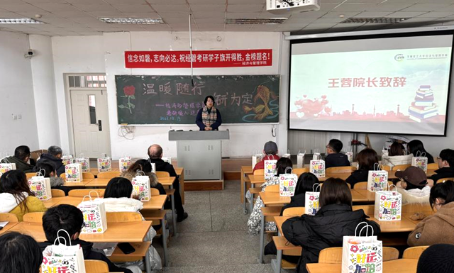 王蓉院长代表学院对考研学子寄予殷切厚望,送上祝福和嘱托,为他们加油打气。她鼓励同学们自信迎考、沉着应考、顺利赢考,并在考研复习方式和考试答题技巧上进行了指导。随后,学院领导带着满满的祝福和期盼为考研学子送上“暖心大礼包”,让同学们一定要坚定信念、披荆斩棘、决战最后时刻。