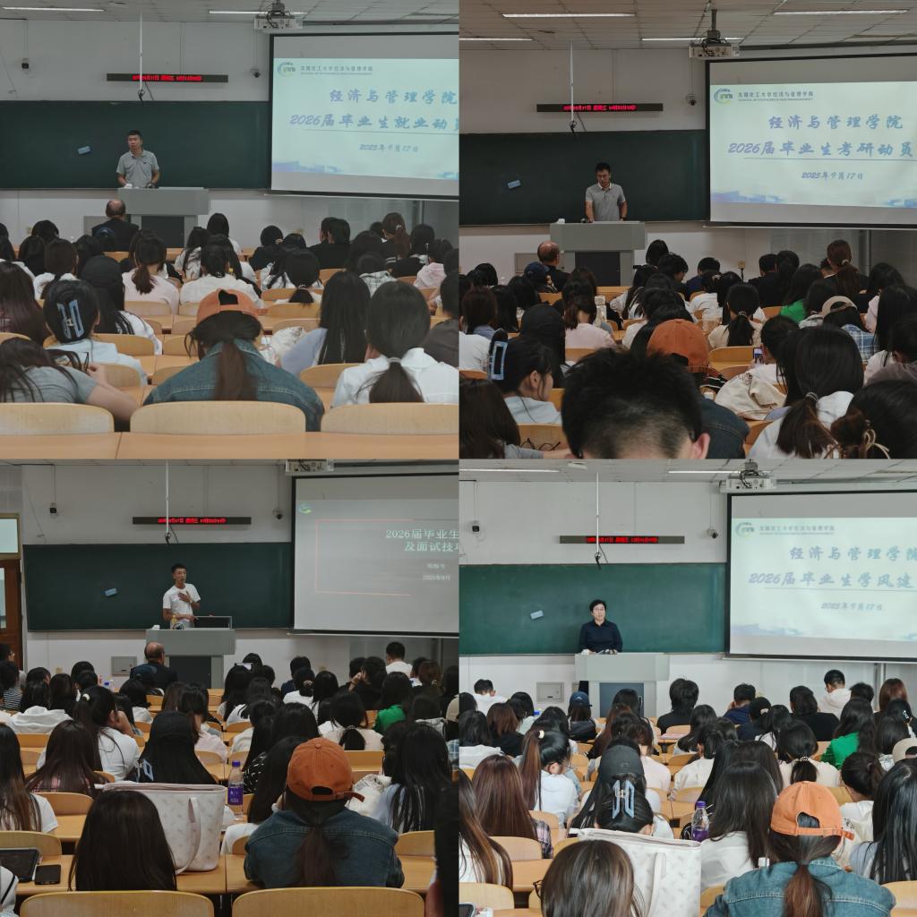 王蓉作总结讲话。一是结合当前经管学科就业形势,科学评估自身水平,建议同学们立足专业优势,既要把握头部企业招聘机遇,也要积极探索基层就业、新兴行业等多元化就业路径。二是鼓励学生报考研究生提升学历水平,深入了解所报学校和专业的优势和特色,制定系统复习计划,充分利用考前三个月关键期成功上岸。三是珍惜毕业前最后一年在校学习时光,多读文献、多参与课题研究,高质量完成学位论文,全面提升专业能力与职业素养,为顺利完成学业走入社会筑牢坚实基础。