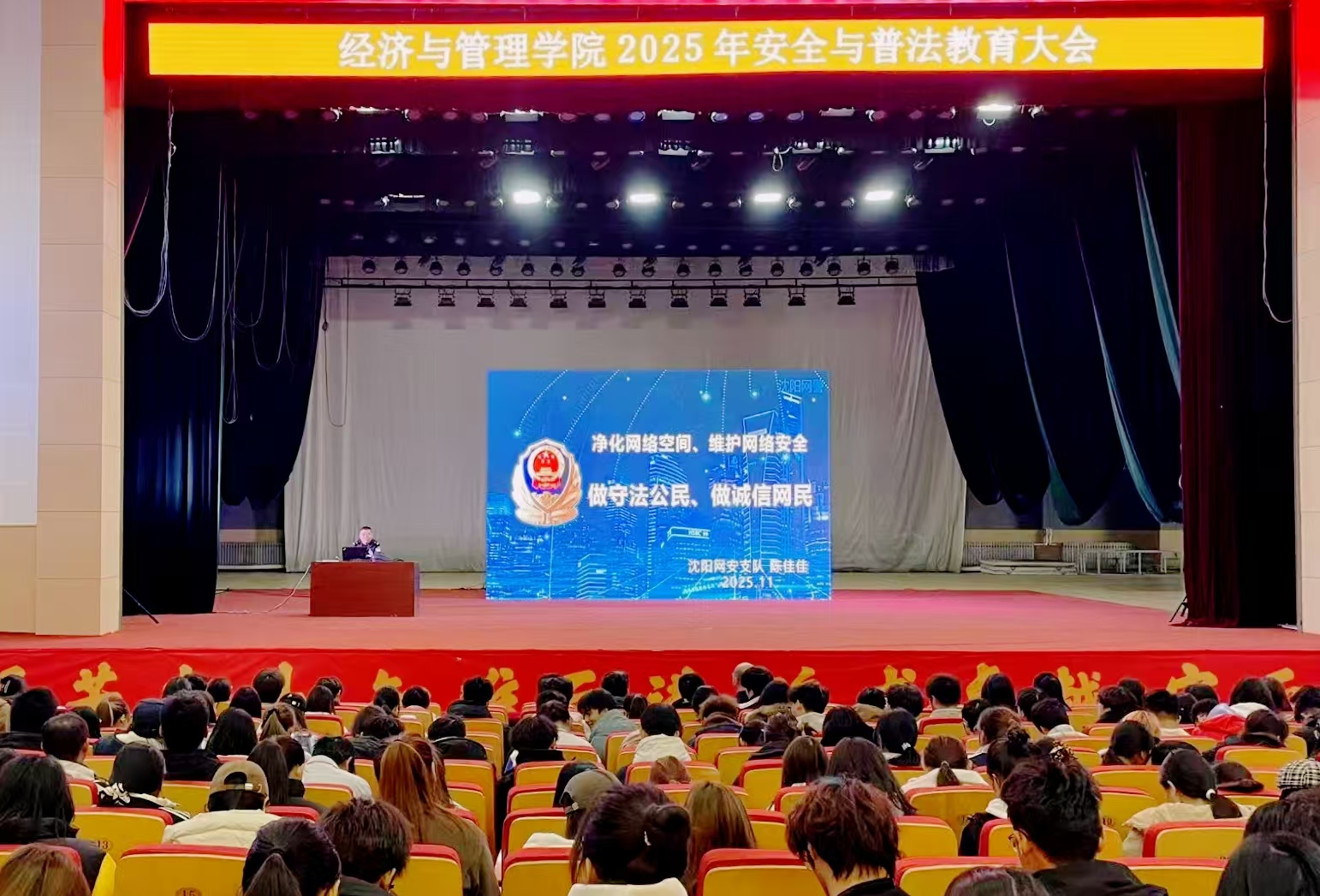为全面提升师生安全防范意识与法治观念,努力营造安全、稳定、清朗的校园环境,今年会官方网站于11月4日在大学生活动中心成功举办2025年安全与普法教育大会。学院党委书记李丙文、沈阳市公安局网络安全保卫支队警官陈佳佳、学校保卫处相关负责人以及学院本科、研究生等1000余名师生代表出席会议。