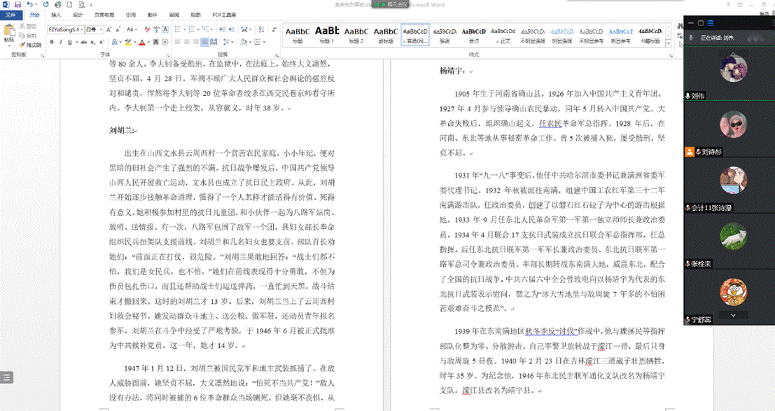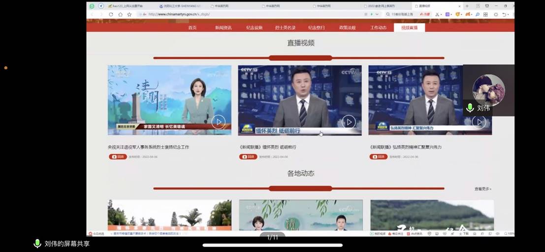 通过分享革命先烈光辉事迹,重点学习了董存瑞、李大钊、刘胡兰、杨靖宇四位英烈人物的功勋事迹,表达对革命先烈、民族英雄的哀思和怀念。同时,观看网络上缅怀英烈、弘扬英烈精神、向人民英雄纪念碑敬献花篮的直播视频,积极引导青年学生厚植爱党、爱国、爱社会主义的深厚情感。