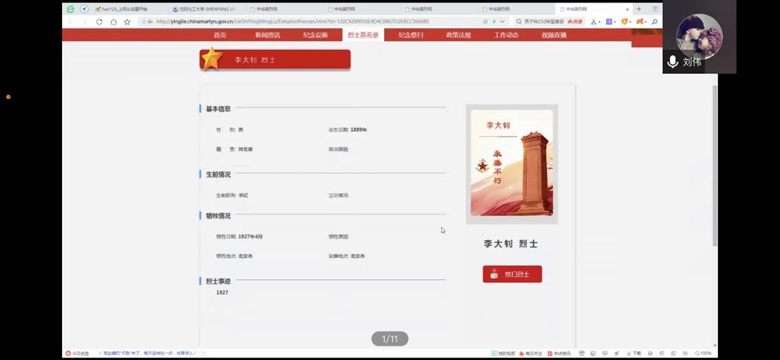 通过访问中华英烈网,带领支部党员了解烈士纪念设施地图,重点访问了辽宁省国家级和省级重点烈士纪念设施。党支部书记刘伟老师为全体党员详细介绍了抗美援朝烈士陵园、辽沈战役烈士陵园、雷锋纪念馆等爱国主义教育基地,叮嘱青年学生要铭记革命先烈的英雄事迹,弘扬爱国主义精神,多到爱国主义教育基地进行参观学习,为自己进行精神洗礼。