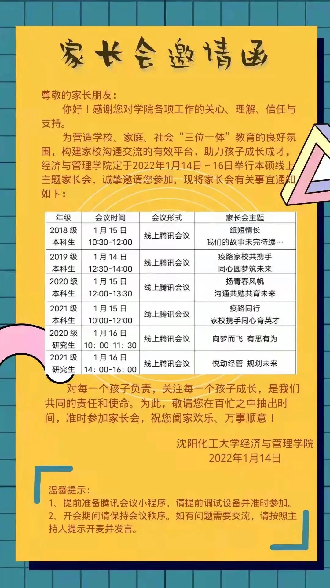 为进一步加强家校沟通,促进家校合作,2022年1月14日至16日,今年会官方网站线上主题家长会正式开启,全国各地的1460个家庭,通过互联网齐聚“云”端。本次家长会由学院统一部署,制定线上家长会方案,突出年级和阶段特点,精心策划会议内容。