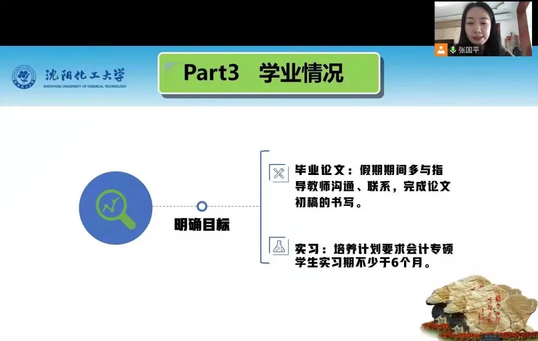 研一辅导员刘伟老师从宿舍管理、校外住宿、反诈宣传等方面提出要求,特别是寒假期间常态化疫情防控和非全学生的疫苗接种工作做具体安排和要求。研二辅导员张国平老师叮嘱学生一定与导师保持联系,在打好理论基础的前提下,把握时间,掌握节奏,做好职业规划,积极开展实习实践,恪守学术规范,不断提升科研水平,努力在“研本共建”方面发挥示范作用,高质量完成学业。